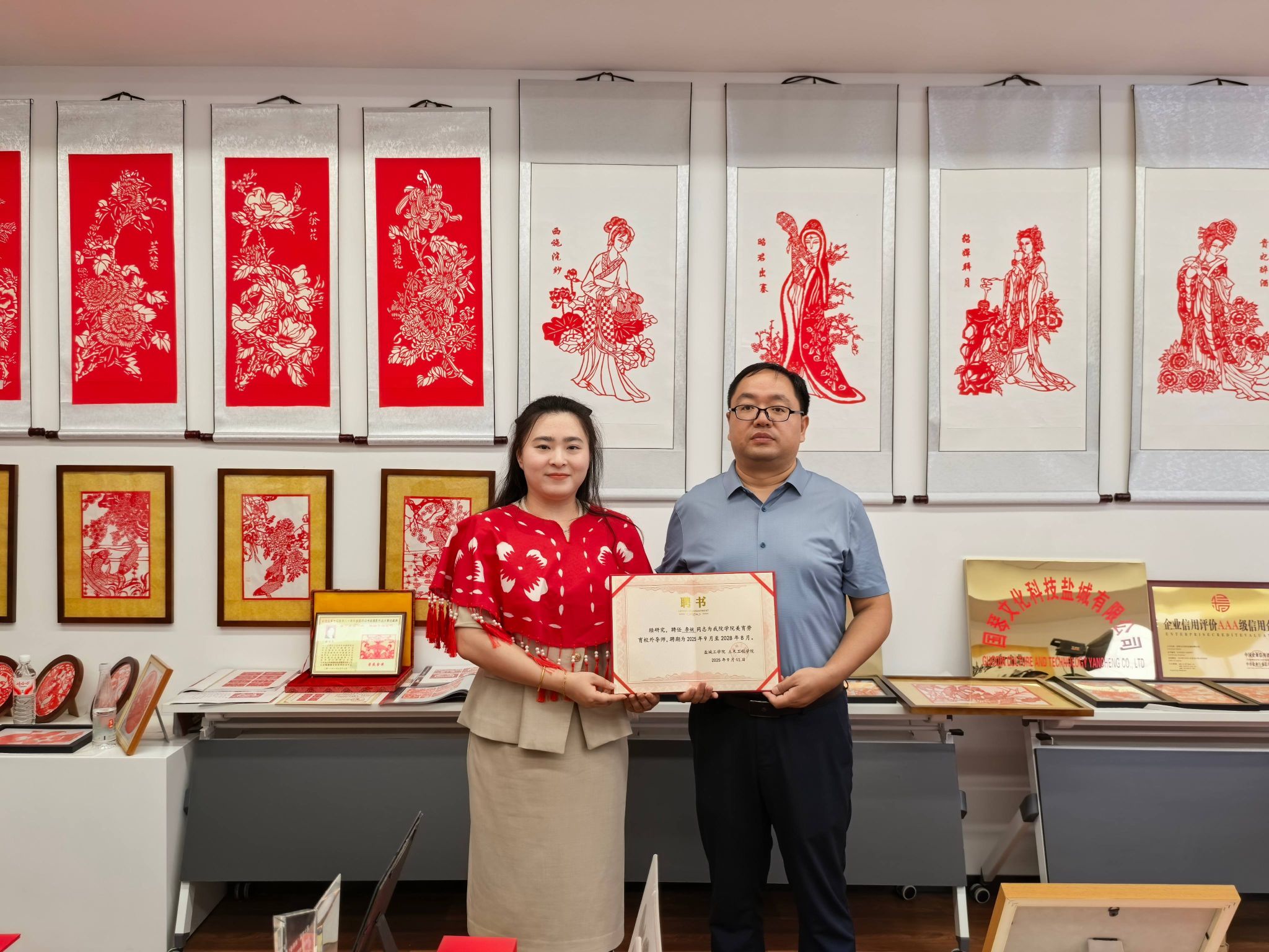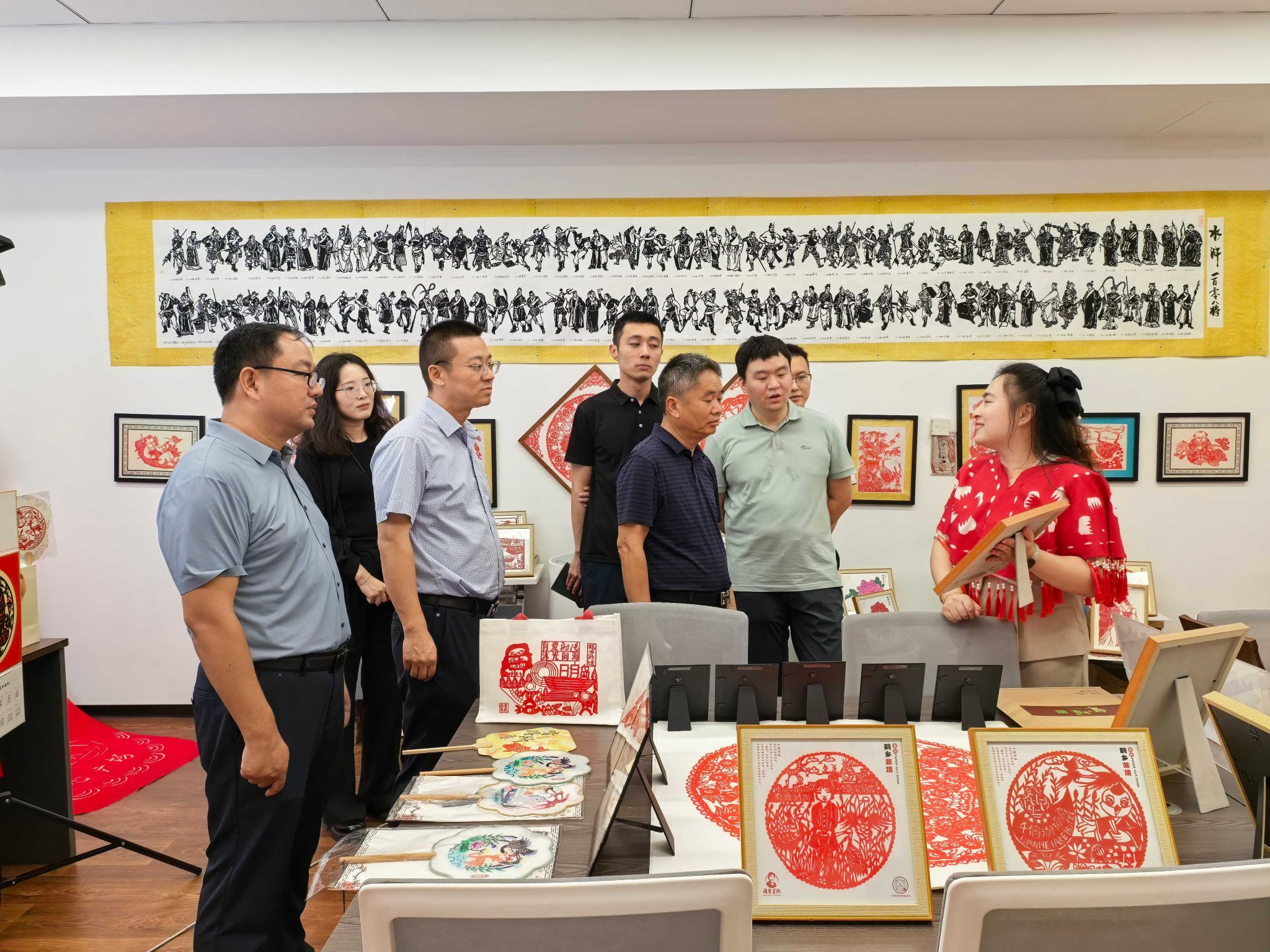 随后,团队探访了省级非遗项目“国琴”剪纸工作室。工作室创始人、国家级非遗剪纸传承人李娴展示了她的母亲——江苏省级非遗传承人姜国琴创作的“水浒108将”“梅兰竹菊”“鹤乡记忆”等剪纸作品,参观了非遗助农卖货直播间,深刻感受传统文化与现代商业模式结合所带来的无限可能。共同探讨双方合作的新模式、新发展,构建常态化实践教学机制,开展学生非遗文化教育,为传承剪纸优秀传统文化作出贡献。