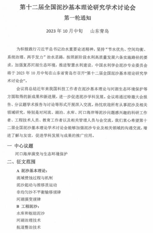 第十二届全国泥沙基本理论研究学术讨论会第一轮通知